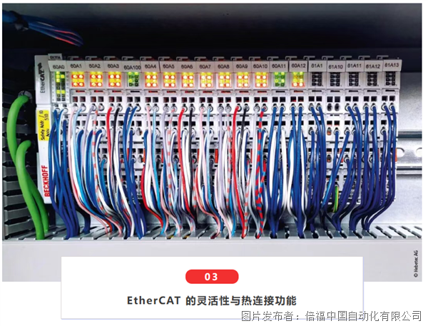 考虑到项目规模相当庞大,与之相匹配的控制组件在数量配置方面也极为可观:分布在总负载达 820 kW 的多个控制柜中,安装了大量模拟量 EtherCAT 端子模块 (EL3024) 和数字量输入/输出端子模块,用于采集所有信号并精确控制电机及液压阀;系统还配备了多款电源端子模块、集成标准与安全 I/O 的 EtherCAT 耦合器 EK1914;以及配备 TwinSAFE 逻辑的 EtherCAT 端子模块 EL6910。控制器采用的是 C6030 超紧凑型工业 PC。